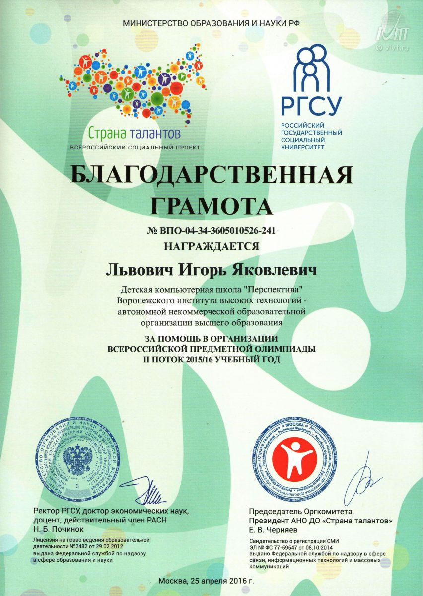 С 6 по 8 мая в Казани прошел Первый Всероссийский форум туристских волонтеров «i.Pro», организованный правительством республики Татарстан при поддержке федерального агентства по туризму. В мероприятии приняли участие представители 27 регионов страны.Воронежский институт высоких технологий на форуме представляли студенты Оксана Струкова, Георгий Тамбовцев, Яна Гуржий, Евгений Максимов и ведущий специалист по работе со студентами Ольга Викторовна Курочкина.Ректор ВИВТ Львович И. Я. и детская компьютерная школа ВИВТ "Перспектива" получили благодарственную грамоту за помощь в организации всероссийской предметной олимпиады II поток 2015/16 учебного года.