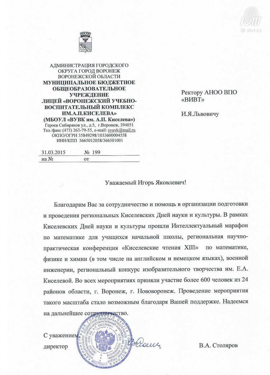 Благодарственные письма, грамоты и сертификаты на имя ректора и коллектива ВИВТ.
